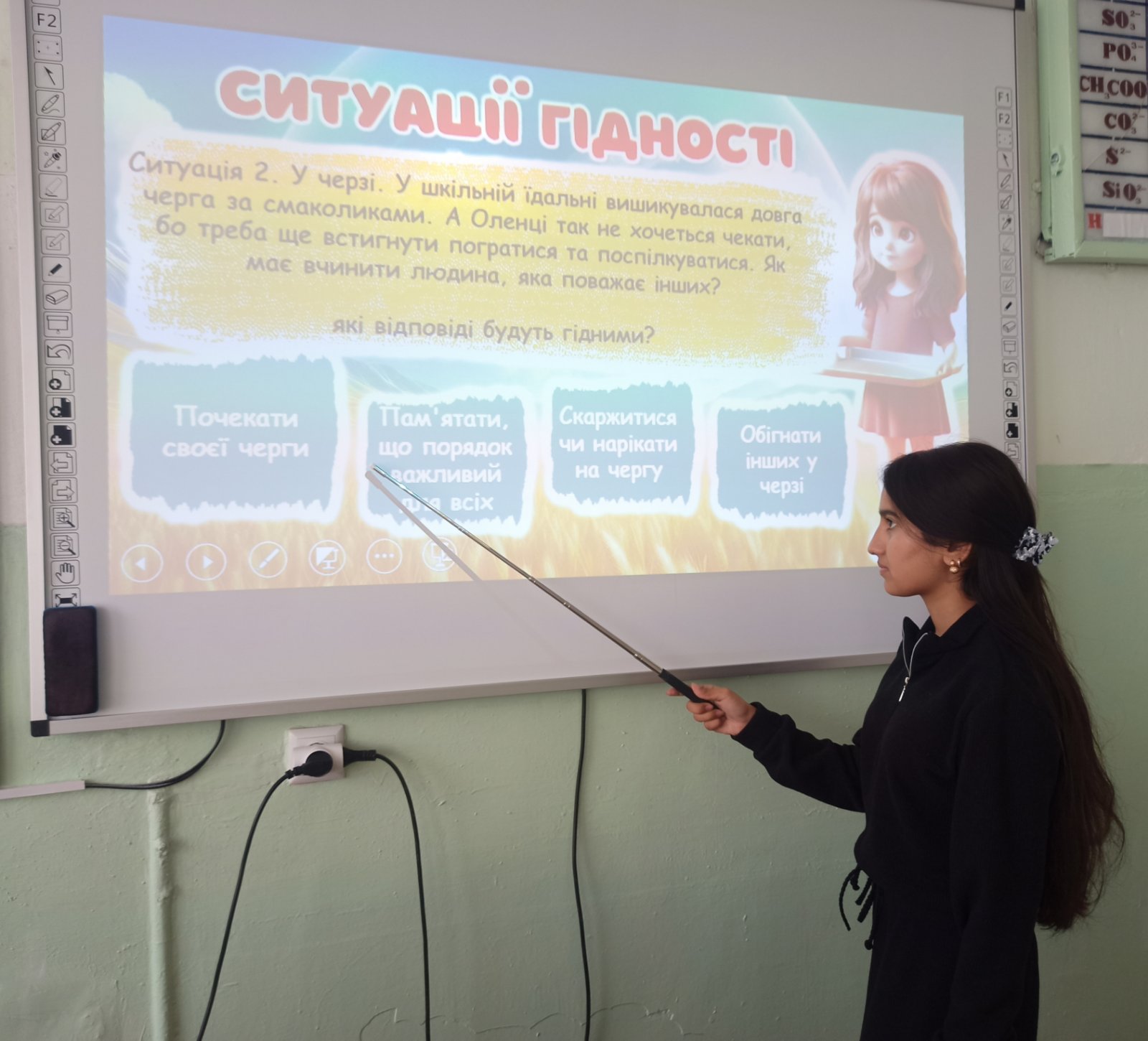 Школярі виконували інтерактивні вправи: «Склади слово», «Що для тебе гідність?», «Ситуації гідності», «Що для мене свобода?», розв’язували ребуси та брали участь у тематичній вікторині. Під час хвилини пам’яті учні вшанували Героїв Небесної Сотні.